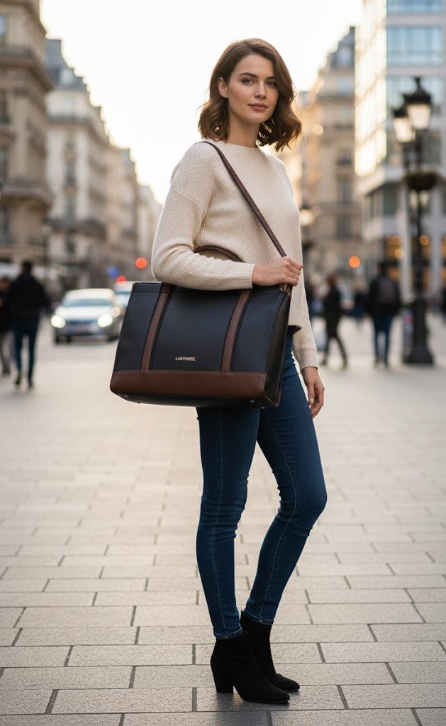 Blue Tote Bag With Brown Straps